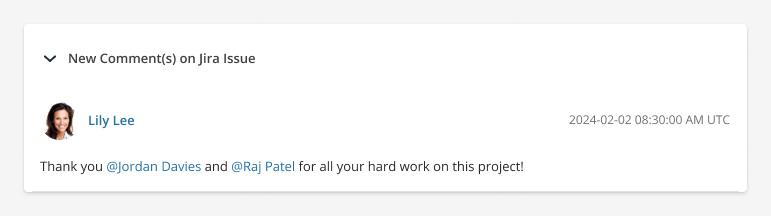 If you add text to an issue which tags specific Jira users in your organization, e.g. in the description or comments, use the events.participants object to identify them properly in the Archive.