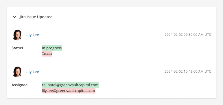 • In the second Event, the assignee is changed.