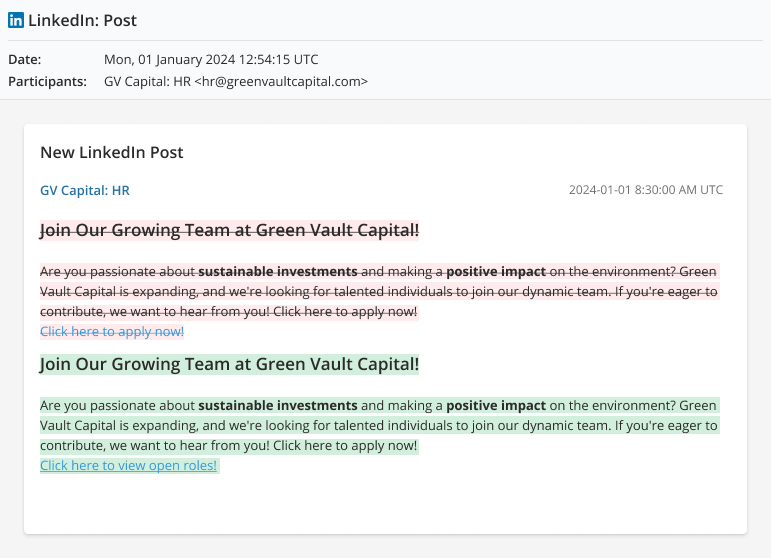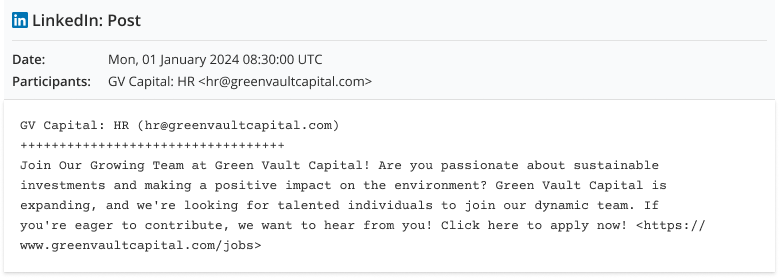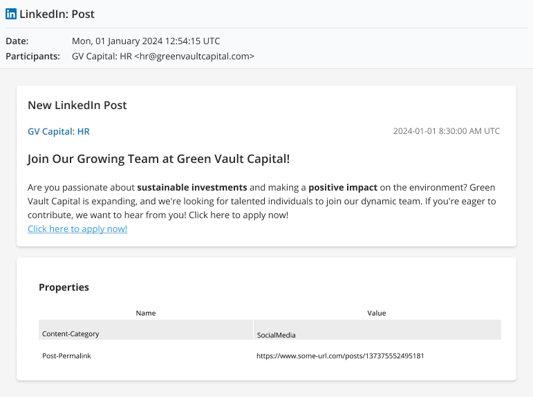 In this example, we use the API to capture a LinkedIn post created by a company’s HR department, with an html body and website link.